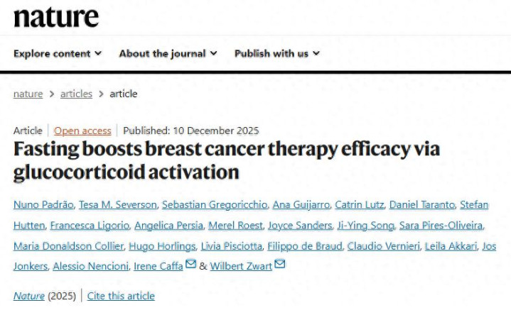 12月10日,《Nature》的研究报道“Fasting boosts breast cancer therapy efficacy via glucocorticoid activation”,不仅揭示了禁食增强乳腺癌治疗效果的表观遗传学机制,更抛出了一个颠覆性的发现:禁食之所以有效,是因为它在体内制造了一种特殊的“压力”环境,激活了糖皮质激素受体(Glucocorticoid Receptor, GR),从而重塑了癌细胞的命运。